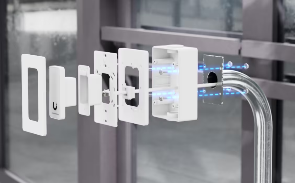 Propojovací skříňka pro přístupové čtečky UniFi a interkomové prohlížeče. Umožňuje montáž na rovný povrch a připojení k 3/4" kabelovému vedení. Úhel uchycení činí 20°.